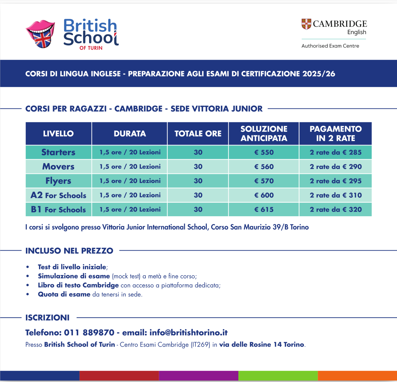 - Quota d’iscrizione all’esame Cambridge già compresa.